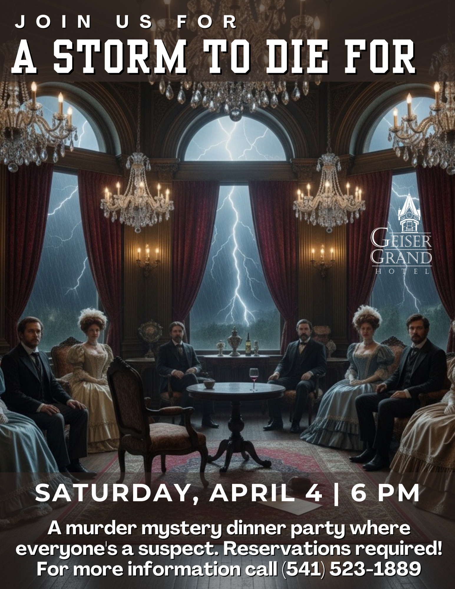 Lightning flashes over the Blue Mountains as society’s finest gather in the grand dining room of the Geiser Grand Hotel. Outside, rain pounds the windows. Inside, crystal glasses shimmer under candlelight—until the storm takes the lights for itself.