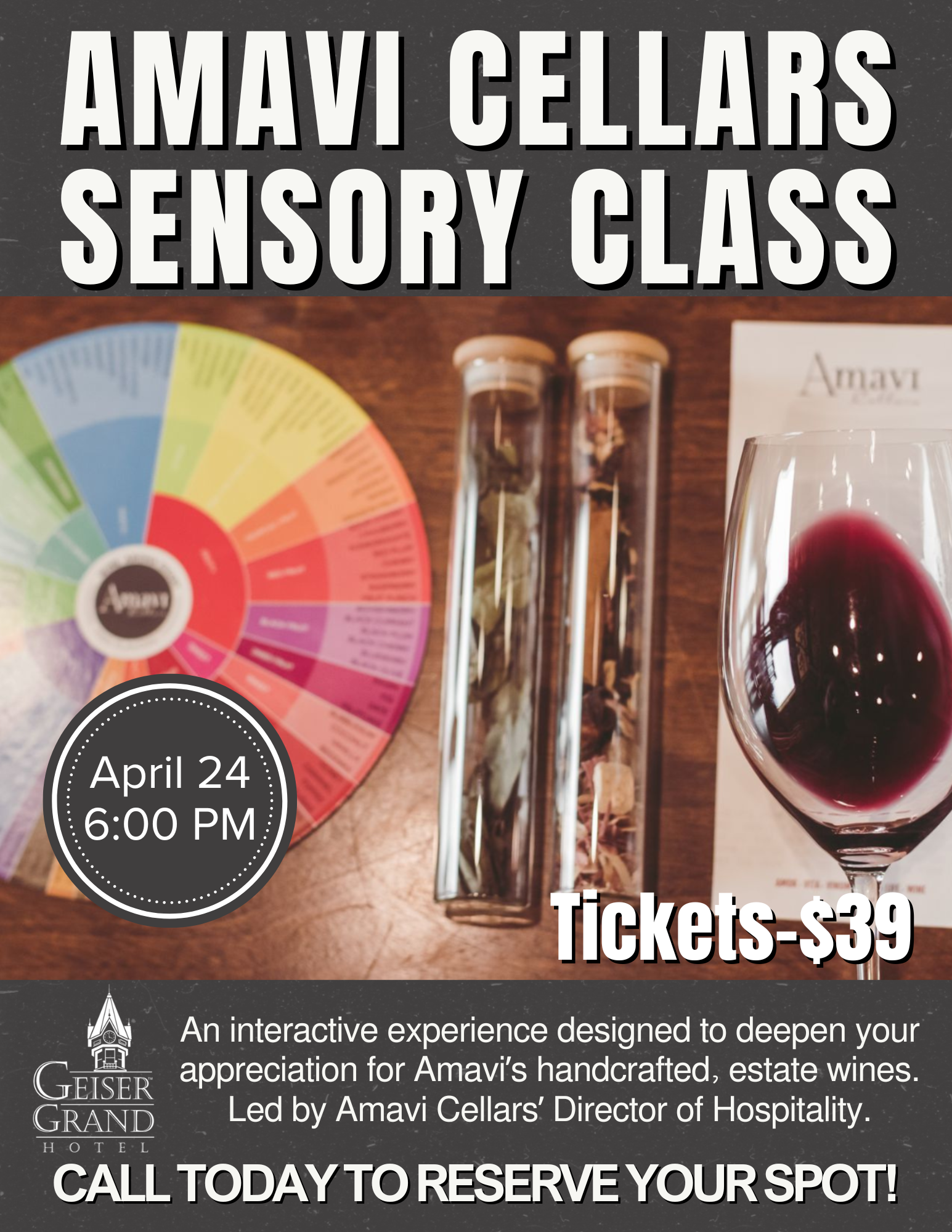 From the bouquet of aromas to the symphony of flavors and textures, this interactive experience is designed to deepen your appreciation for our handcrafted wines. Engage your palate and refine your tasting skills in a unique, hands-on exploration of what makes Amavi Cellars truly exceptional.