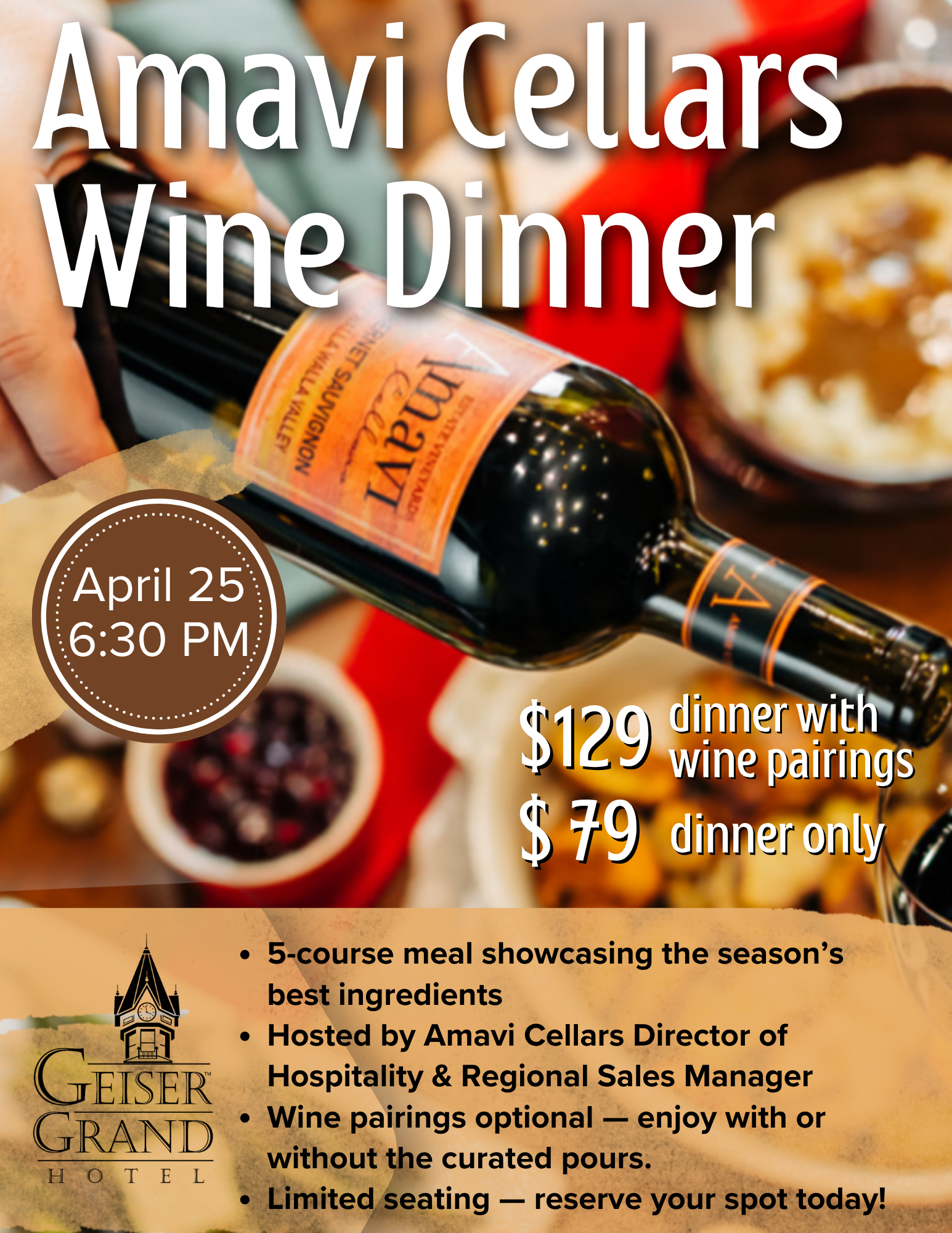 Join us for an unforgettable evening of food, wine, and hospitality at the historic Geiser Grand Hotel. This exclusive five-course dinner showcases the season’s best ingredients, thoughtfully crafted to pair beautifully with wines from Amavi Cellars.
