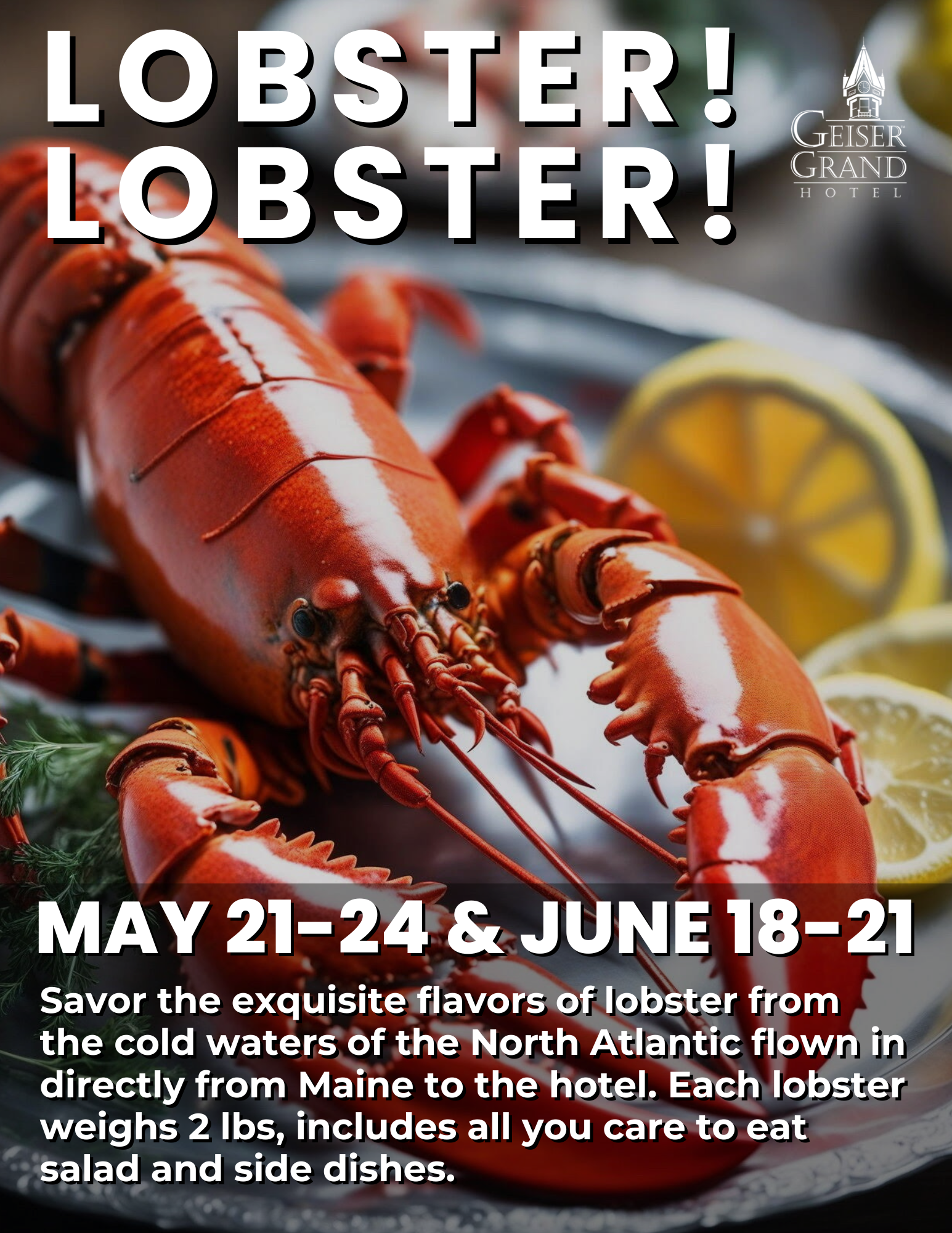 Now is your chance to dive into the ultimate indulgence of a lobster dinner at the Geiser Grand Hotel. Savor the exquisite flavors of lobster from the cold waters of the North Atlantic flown in directly from Maine to the hotel.